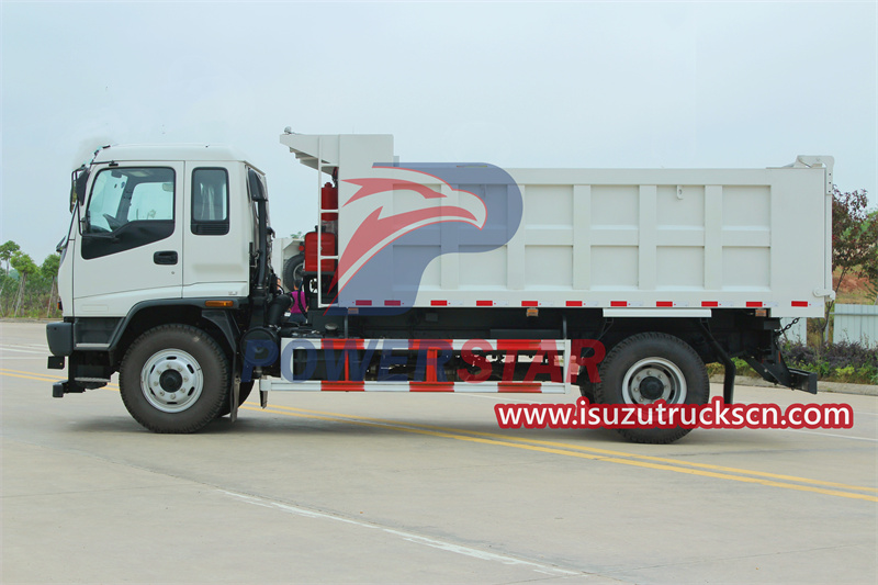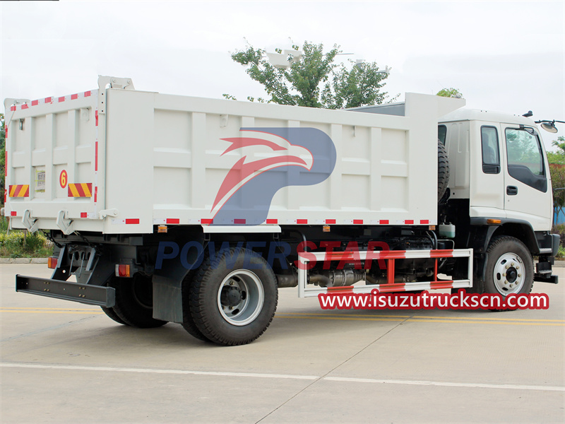 Garbage dump bodyThe Isuzu FVR dump truck is a high-quality commercial vehicle designed for heavy-duty cargo duties such as cargo transportation and construction sites. This car is equipped with a powerful and reliable diesel engine, which not only has excellent power and torque output, but also uses advanced fuel injection system and turbocharging technology to improve fuel efficiency and power performance. In addition, its load capacity is excellent and can easily cope with various cargo transportation needs, up to 8-16tons depending on configuration and needs. The vehicle is also equipped with a convenient and fast dump function, with built-in high-quality hydraulic system and reliable dump mechanism, making unloading more efficient and safer. The cab is spacious and comfortable, providing a good driving environment. At the same time, the vehicle is also equipped with advanced safety systems, such as ABS, TCS and ESC, to provide higher safety performance. Maintenance and maintenance are also very convenient, using durable materials to manufacture various parts and components, while providing comprehensive after-sales service and repair support.