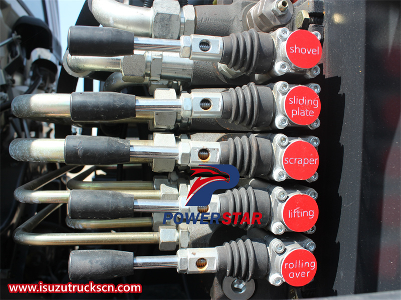 The system is controlled from the PLC control box, which enables, start, stop, 1-cycle, continuous cycles, and rescue activities. Tailgate and ejector controls are in front of the body. All devices for loading control are mounted on the tailgate right side, and all are manual control for safety purposes. Compaction is controlled electrically via push-buttons, and manually in case |