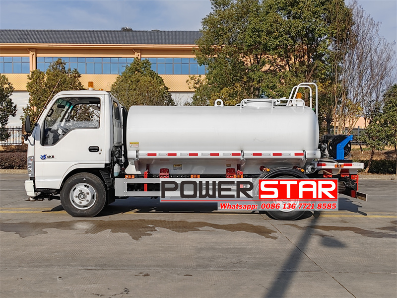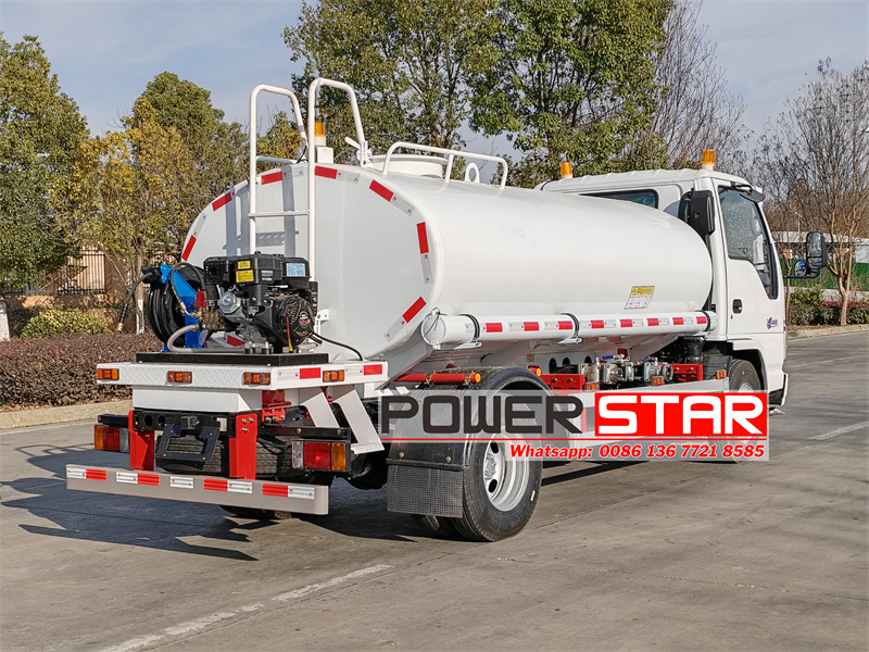 POWERSTAR 's Isuzu ELF 100P water spray truck is used for watering operations.Which is modified on the Isuzu NKR 100P light chassis,with 4KH1 120HP engine,2999ml displacement,Isuzu MSB 5-speed gearbox.The truck has a 5000L ellipse carbon water tank,with 65QZF-40/50 water pump,rear is a fuel ultra-high pressure cleaning machine,front spray, These ensure that the vehicle can efficiently carry out the watering operations.