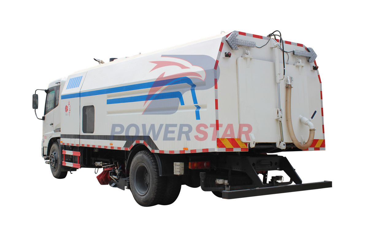 The Sweeper truck also adopts the way of vacuum suction and sweeping combination, wet dust removal, electro-hydraulic control and hydraulic dumping unloading to clean the road.