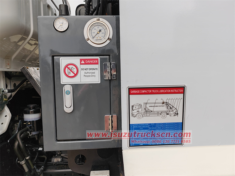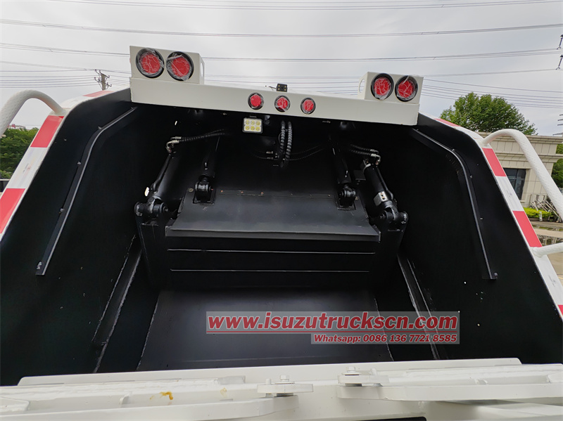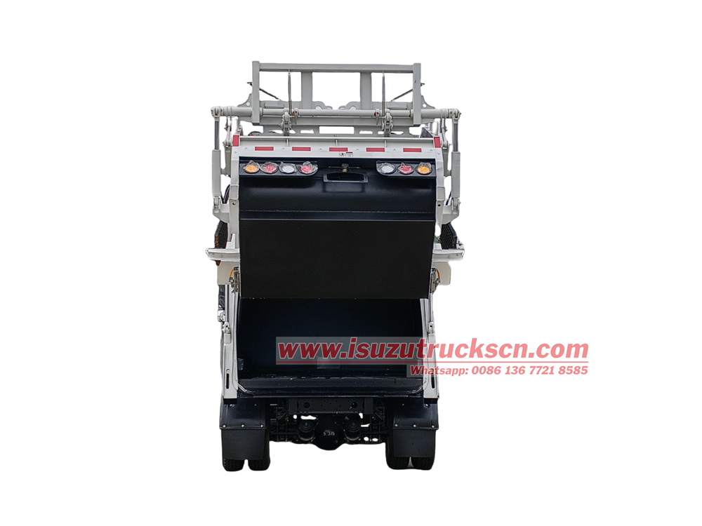 Isuzu KV600 6cbm garbage compactor truck is modified from Isuzu KV600 chassis, with a wheelbase of 3365mm, equipped with Isuzu 4KH1CN6HB 132 horsepower diesel engine and Isuzu MLD 6-speed gearbox, which is powerful and has low fuel consumption. The upper body adopts 6cbm arc carbon steel garbage bins, equipped with hanging bucket flipping mechanism and two-way compression technology to improve loading efficiency and prevent leakage. The vehicle supports three operation modes: cab electronic control, manual hydraulic and tail electronic control to meet different operation needs.