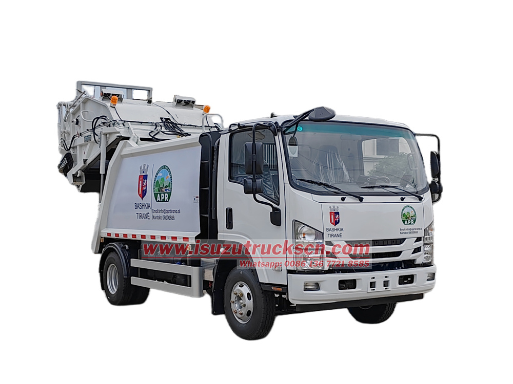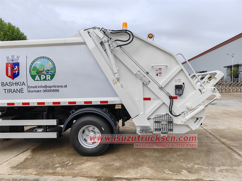 Equipped with hanging bucket flipping mechanismAlbania Isuzu 6 cbm hydraulic compaction truck is an efficient and reliable special vehicle for collecting and transporting urban domestic garbage. It has a wheelbase of 3365mm, is equipped with a 120-horsepower Isuzu engine and a 5-speed gearbox, and is powerful and fuel-efficient. The upper body adopts a 6-cubic-meter arc-shaped carbon steel box, which is anti-corrosion and rust-proof and durable. The tailgate is equipped with a bucket flipping mechanism, which is suitable for 120L/240L standard garbage cans, and is driven by hydraulic cylinders to flip and dump garbage.