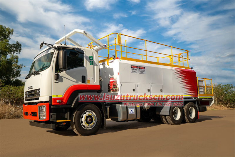 The Isuzu GIGA 6X4 15cbm fuel and lubrication service vehicle is equipped with an Isuzu 6UZ1 TCG61 380HP engine and a Fast 12-speed transmission. The vehicle is equipped with a 9,000L diesel tank, four 800L oil tanks, a 750L water tank, an 800L waste oil tank, a 750L coolant tank, and a 500L bulk grease tank. It is equipped with an oil product delivery system, a diesel delivery system, a water delivery system, a coolant system, and a high-pressure grease system. The vehicle also features a rear platform diesel screw compressor. The vehicle is also equipped with a ROPS, a diesel flow meter with a digital fuel distribution display, a tool box, an internal LED work light, a handrail on the top of the fuel tank, and a ladder.