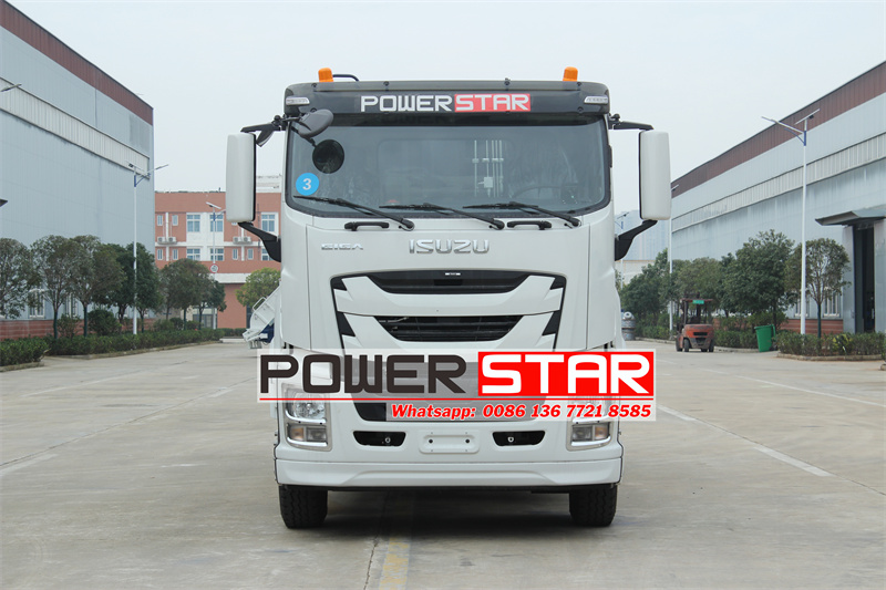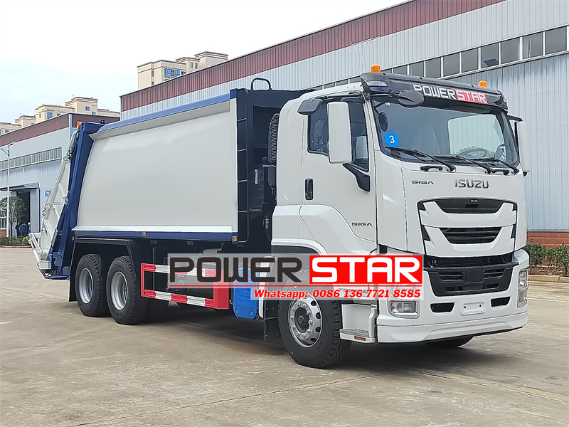 Isuzu GIGA 6X4 garbage compactor truck,Its chassis is the Isuzu GIGA VC61 6X4 cab chassis, with a wheelbase of 4600+1370mm, a 6UZ1-TCG61 380HP engine, a FAST 12 speed gearbox, and a Euro 6 9839ml displacement. The upper part is a 25 square garbage bin made of curved carbon steel material with four sides and five bottoms. The vehicle is controlled by four operation modes, including the cab electric control box, the driver side manual hydraulic control lever, the left tailgate electric control box, and the right tailgate manual control lever.