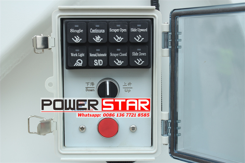 Cab electric control box: This electric control box has buttons such as stop&start, PTO, work light, tailgate up/down, loading mode, discharge mode, tailgate clean, shock push/pull, etc., which can control the corresponding operations.