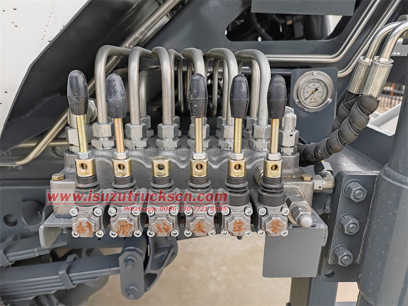 Isuzu 700P 6cbm self-loading garbage truck is modified on the basis of Isuzu 700P chassis, with a wheelbase of 3815mm, equipped with Isuzu 4HK1-TCG61 190HP engine, Isuzu MLD 6-speed gearbox, and a 6cbm self-loading and unloading garbage box. It adopts a ship-shaped box and high-position loading technology. The garbage port of the box is at the top of the box. It is a high-position loading and unloading structure, with hydraulic outriggers at the rear and operating valves. It adopts a PLC intelligent control system.