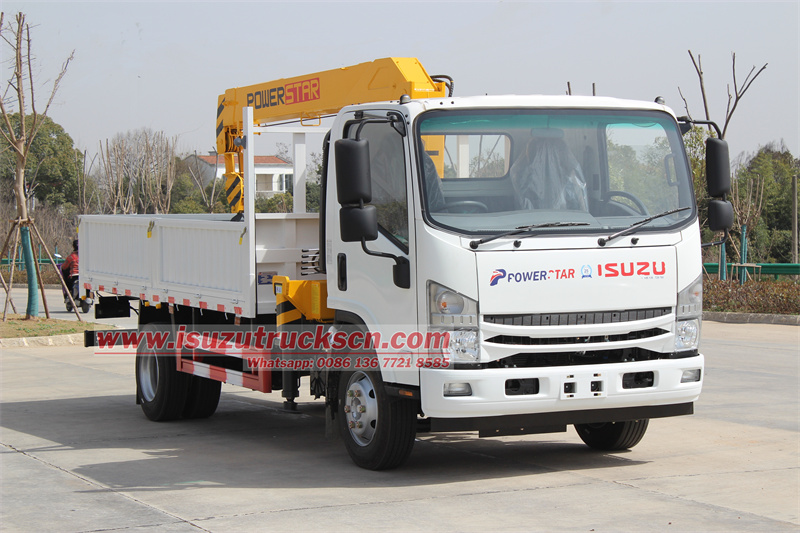 XCMG KSQS125-3 3 sections telescoping boomIsuzu 700P RHD truck mounted crane is an engineering vehicle that integrates transportation and lifting functions based on the Isuzu 700P right-hand drive chassis. Equipped with a 4HK1-TCG61 190 horsepower engine and a 6-speed manual transmission, it has strong power and can easily cope with complex road conditions in cities and construction sites. The vehicle has a wheelbase of 3815mm, a cargo box size of 4500×2250×550mm, a side panel of 3mm, and a bottom panel of 4mm thickness, which is strong and durable and meets the heavy-load transportation needs of building materials, equipment, etc. It is equipped with a XCMG KSQS125-3 3-section straight arm crane, with a maximum lifting of 5 tons, a maximum lifting height of 10.1 meters, a maximum working radius of 8.7 meters, and a 360° full rotation design, which can accurately complete operations such as street lamp maintenance and equipment lifting.