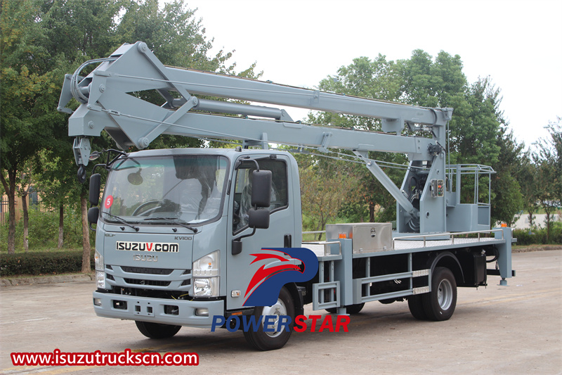 Isuzu brand Insulated Bucket Manlift Truck also called Isuzu KV100 knuckle boom aerial platform truck,Insulated boom lift bucket truck Isuzu,Isuzu KV100 manlifter boom truck with basket,Isuzu 14m folding boom lift truck,Isuzu KV100 bucket truck.The Isuzu brand Insulated Bucket Manlift Truck is an insulated bucket manlift truck that combines power, efficiency, and safety. It is designed to provide operators with a stable and secure platform for performing high-altitude tasks such as maintenance, construction, and repair work. The truck is equipped with a knuckle boom (also known as a knuckle arm or folding boom), which allows for precise positioning and extended reach.