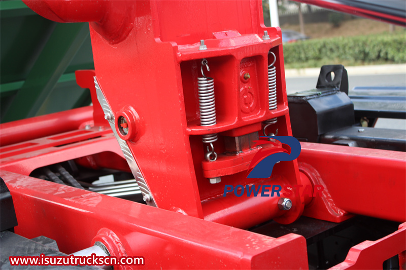 Isuzu 700P 6-ton hook-arm garbage truck is composed of a car chassis, a main oil cylinder for pulling arm, an attached frame, a turning frame, supporting legs (, locking frame, locking cylinder and multi-way reversing valve. One end of the turning frame is connected to the attached frame, and the other end is provided with a movable pulling arm, and a locking system is installed in the middle; one end of the movable arm oil cylinder is connected to the movable arm, and the other end is connected to the attached frame;
