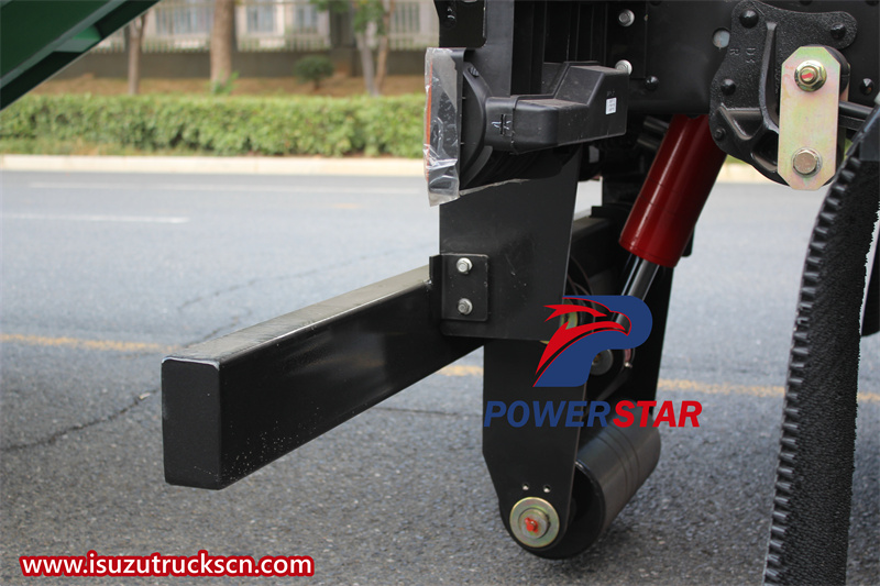 Step 3. When the arm hook is hooked to the box body hook, continue to push the arm operating handle down to the dropped position to allow the garbage box to continue to load the vehicle (Note: Make sure that the longitudinal beam of the garbage box is located between the two rear rollers at the tail of the attached frame);