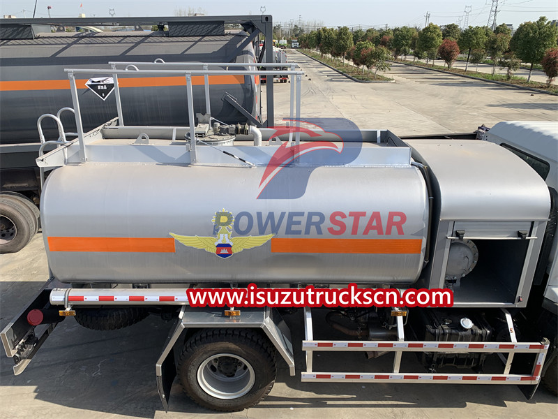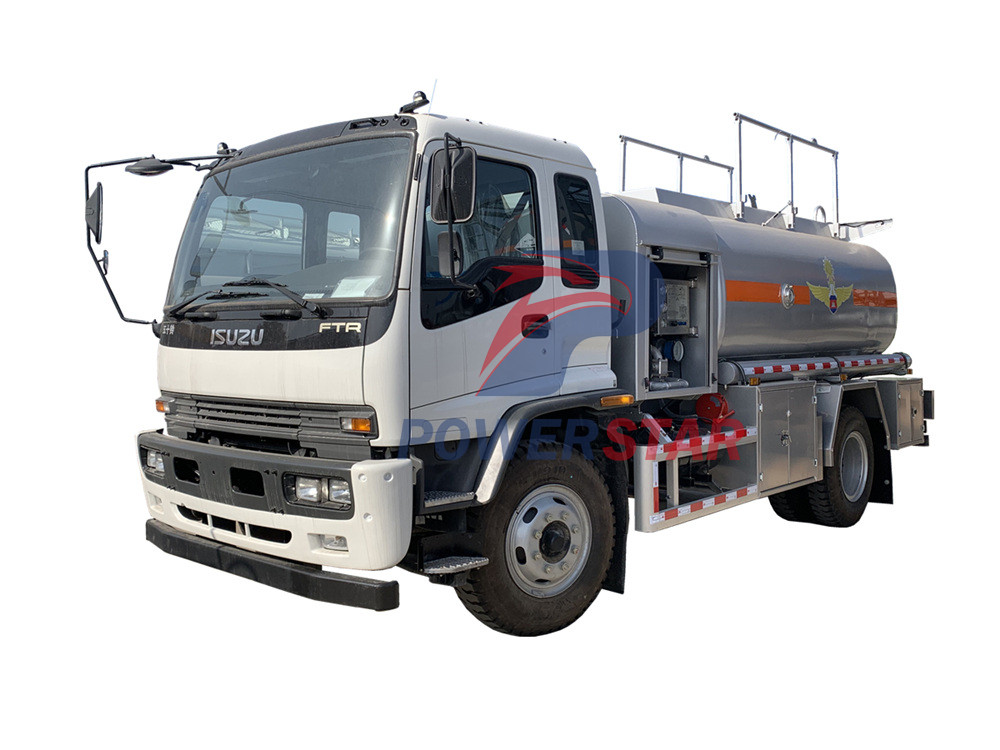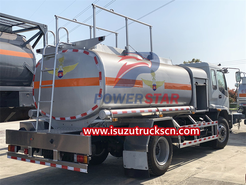 The aircraft refueling truck produced by POWERSTAR is modified based on the Isuzu FTR chassis. The tank body is made of aluminum alloy or stainless steel. It is equipped with a pumping system, a refueling system and an independent refueling machine compartment. It has a reasonable structure and is easy to use. The fuel in this tank can be filtered and measured, and then injected into aircraft fuel tanks or other oil-receiving equipment through the gravity refueling reel hose. The rear of the ISUZU jet fuel bowser is equipped with a special connector for aviation fuel and is equipped with a ladder to facilitate personnel getting on and off the tank body.