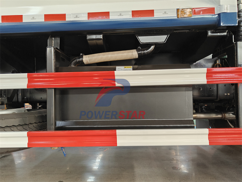 The electric control box on the left side of the tailgate is a key component of the rear control of the Isuzu FVR GIGA compression garbage truck. It is mainly used to control the opening and closing of the tailgate. The tailgate electric control box also uses advanced electronic control technology, which can achieve fast and precise control of the tailgate. The driver can easily achieve remote control of the tailgate through the electric control box in the cab or the electric control box button at the tailgate. This design not only improves the convenience of operation, but also ensures the safety and stability of the tailgate during opening and closing.