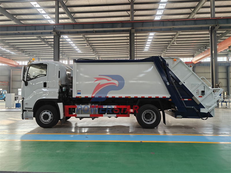 Isuzu new FVR chassis,large capacity garbage boxIsuzu FVR GIGA truck with compactors is an efficient compression garbage truck designed for urban cleaning. It is built on Isuzu's new FVR GIGA chassis, with a body size of 9070*2500*3300mm and a wheelbase of 4500mm. It is equipped with a 6HK1-TCG61 240HP engine and a FAST 8-speed gearbox, providing strong power and smooth control. The 14-cubic-meter compression garbage bin volume greatly improves the garbage handling capacity. Advanced control systems such as the electric control box in the cab, the hydraulic control lever on the driver's side, the electric control box of the tailgate and the manual control box ensure convenient, safe and reliable operation.
