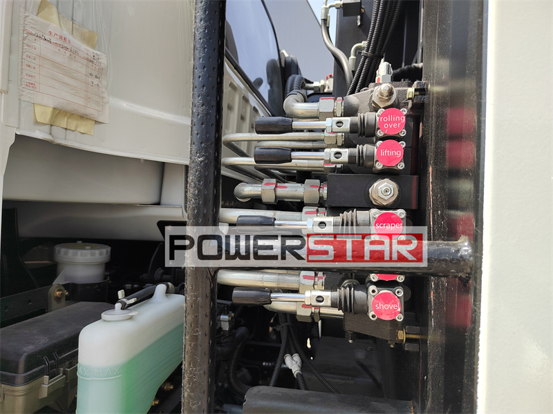 The hydraulic operating joystick provides the driver with a more direct and flexible operating method. The hydraulic operating lever is located in the driving direction, which is convenient for the driver to operate outside the vehicle. By pulling or pushing the operating lever, the driver can manually control the hydraulic cylinder of the compression mechanism to start, stop and adjust the compression strength of the compression mechanism. In addition, the hydraulic operating lever is also equipped with loading and unloading control switches, through which the driver can manually control the opening and closing of the compartment to load and unload garbage. This operation method is particularly important when the electric control system fails or requires more direct operation, ensuring the reliability and flexibility of the garbage compactor.