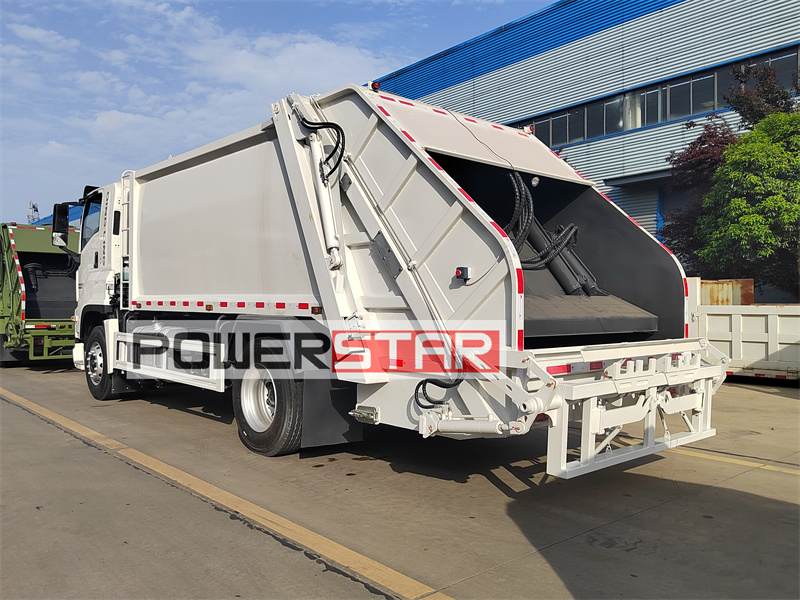 POWERSTAR's Isuzu GIGA 16 cbm compression garbage truck is modified on the basis of Isuzu new FVR GIGA 5X cabin 4x2 chassis. It is equipped with an Isuzu 6HK1 240HP diesel engine, which has strong power and is matched with a FAST 9-speed gearbox. The gear shifting is smooth, and it is equipped with A/C, USB, and power steering. The vehicle is equipped with a 16-cubic-meter compression box and is equipped with 3 operating methods to maximize the compression efficiency.