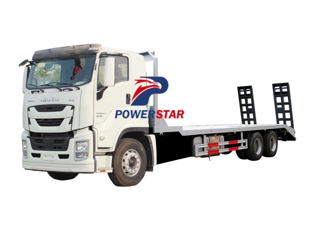 Latest isuzu giga 20 tons 6x4 6 wheels low flat bed excavator carrier flat plate transport truck, Isuzu Excavator transport carriers are specialized vehicles designed to transport excavators and other heavy machinery. The type of carrier used depends on the size and weight of the equipment being transported.