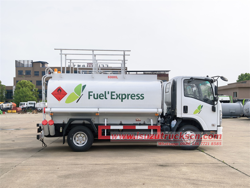 The ISUZU KV600 6 cbm fuel tanker truck,3365mm wheelbase,ISUZU 4KH1N6HD 150hp engine, MYY 6-speed gearbox. The uperstructure consists of a 6cbm oval-shaped carbon steel tank (5mm thick), with one European standard manhole on the top, one aluminum alloy bottom valve, one unloading valve, and a bottom valve switch. It features a Chinese-made oil pump with a flow rate of 30m³/h, a Censtar fuel dispenser, a 15M fuel hose reel and a fuel nozzle; also features inlet and outlet pipelines, a toolbox, ladder, folding guardrails, 2 fire extinguisher, and two side storage box with oil delivery pipes.