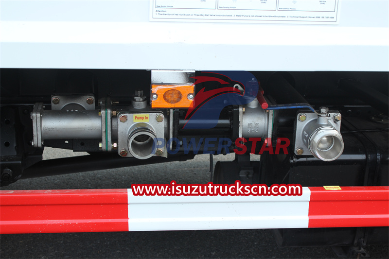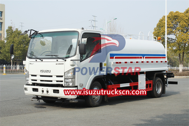 Isuzu NPR potable water tanker trucks water wagon Sprinkles water bowser standard configuration: former blunt sprinkling, take lateral jet after sprinkled with tank after, after work platform, platform after install greening sprinkling, guns regt can rotate 360 degrees, but even after adjusting heavy rain, rain, drizzle, mist shape, straight strong shape, range 30 meters. Take self-priming, since row function, take fire interface, with their valves, install screen.
