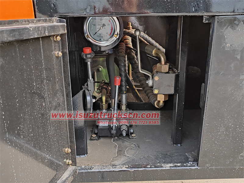 The vehicle's control system is also very user-friendly. It is controlled by the manual hydraulic operating valve on the driver's side and the hydraulic operating valve on the lower left of the tailgate. The operator can choose the appropriate operation method according to the working position and his own habits, which improves the convenience and safety of the operation. In addition, the vehicle is also equipped with a toolbox for convenient storage of various working tools, so that the operator can quickly access the required tools during the operation, improving work efficiency.