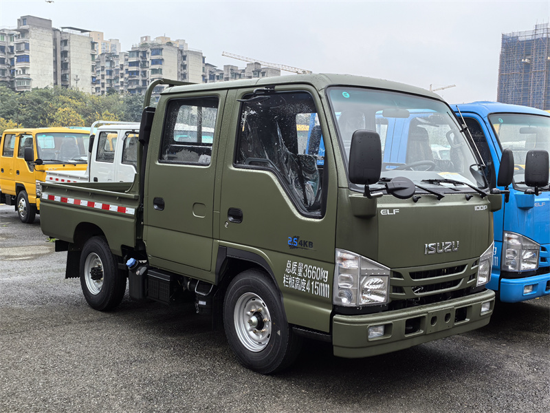 Single axles,4+1The Mini Isuzu 4x4 truck with double cabin is a light-duty truck designed for urban logistics and short-haul transportation. The vehicle has a gross vehicle weight of 3.66 tons and a payload capacity of 1.245 tons. At its heart is a reliable Isuzu 4KB1 diesel engine and a 5-speed transmission, paired with a 4.875 rear axle ratio, ensuring easy starts under heavy loads and strong climbing ability. The double-cab design allows for multiple passengers, and the 2-meter-long carbon steel cargo box (3mm side, 4mm bottom) is robust and durable. Its excellent reliability, economy, and versatility for both passengers and cargo make it a practical choice for short-haul delivery in commercial and other sectors.