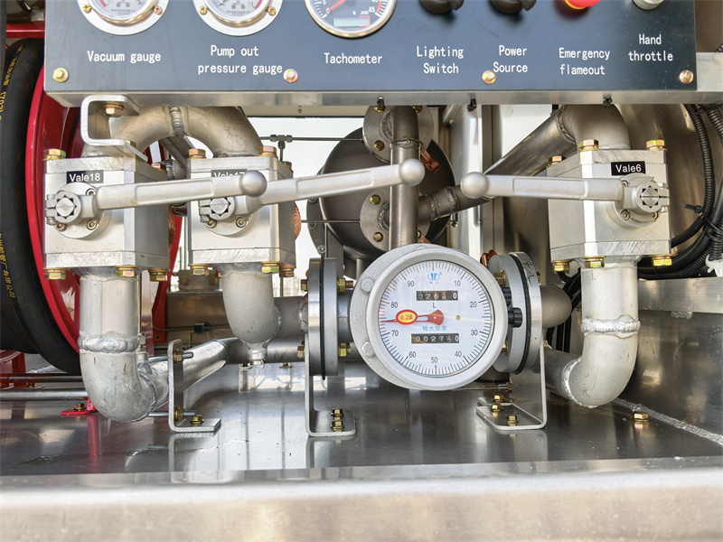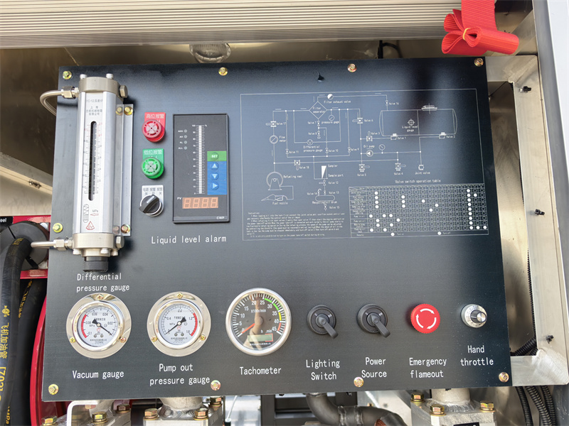 • Control panel: Includes piping diagram, valve switch operation table, power switch, differential pressure gauge, liquid level alarm, vacuum gauge, pump out pressure gauge, tachometer; light switch, power source, emergency flameout, hand throttle, and other knobs.