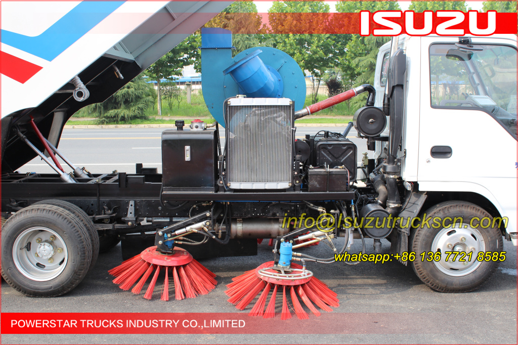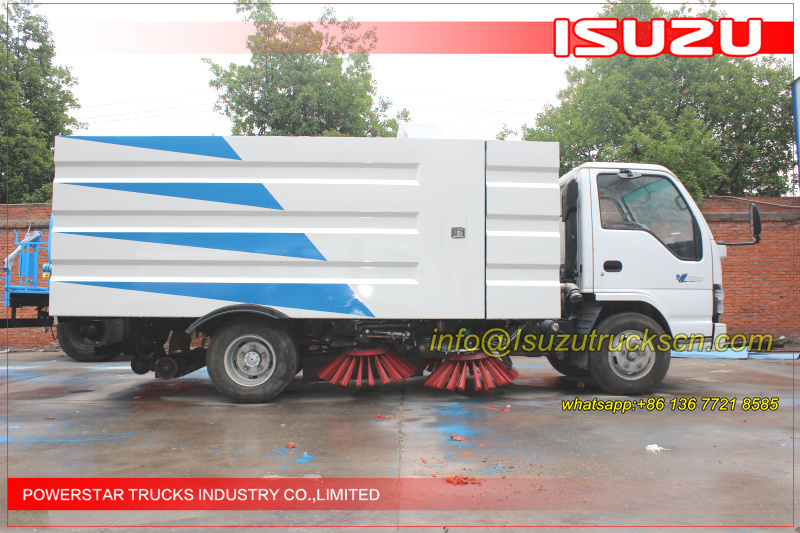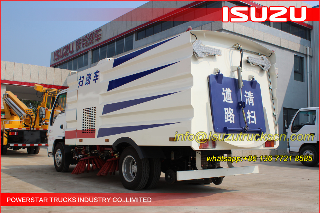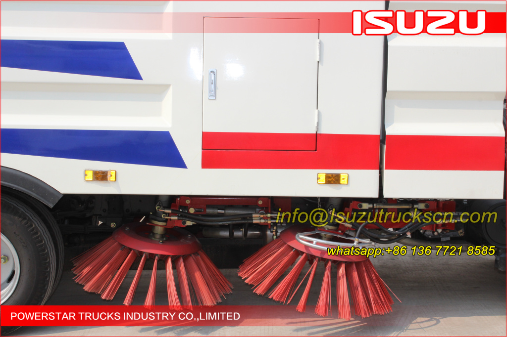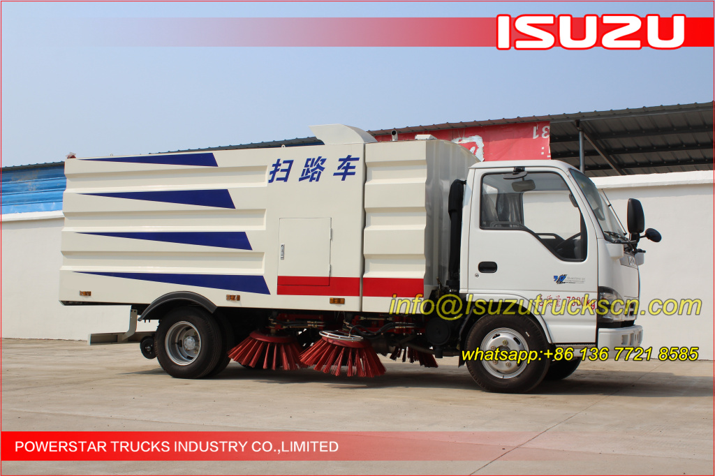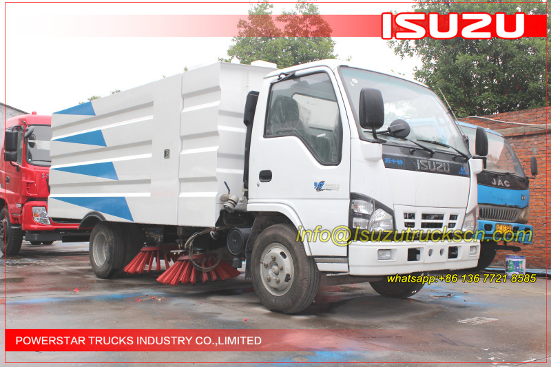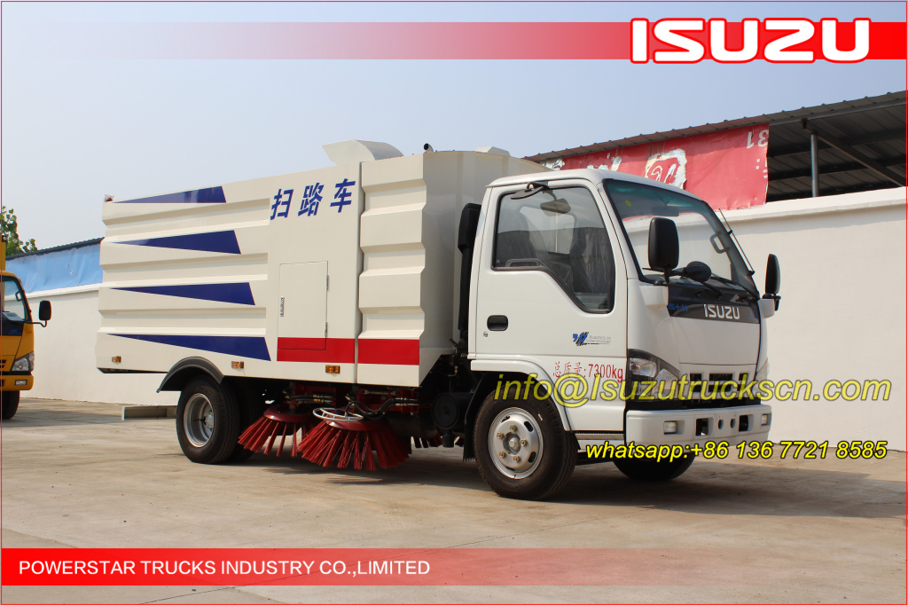 Road sweeper truck ISUZU (also street sweeper truck Isuzu, Isuzu truck mounted road sweeper, brush road sweeper, vacuum road sweeper, wet road sweeping vehicle) This Isuzu road sweeper truck has a simple and proper structure with four brushes in the middle and a suction port at the back part of the vehicle. The efficient suction system makes low noises when the vehicle is working. The whole vehicle is stable in performance.