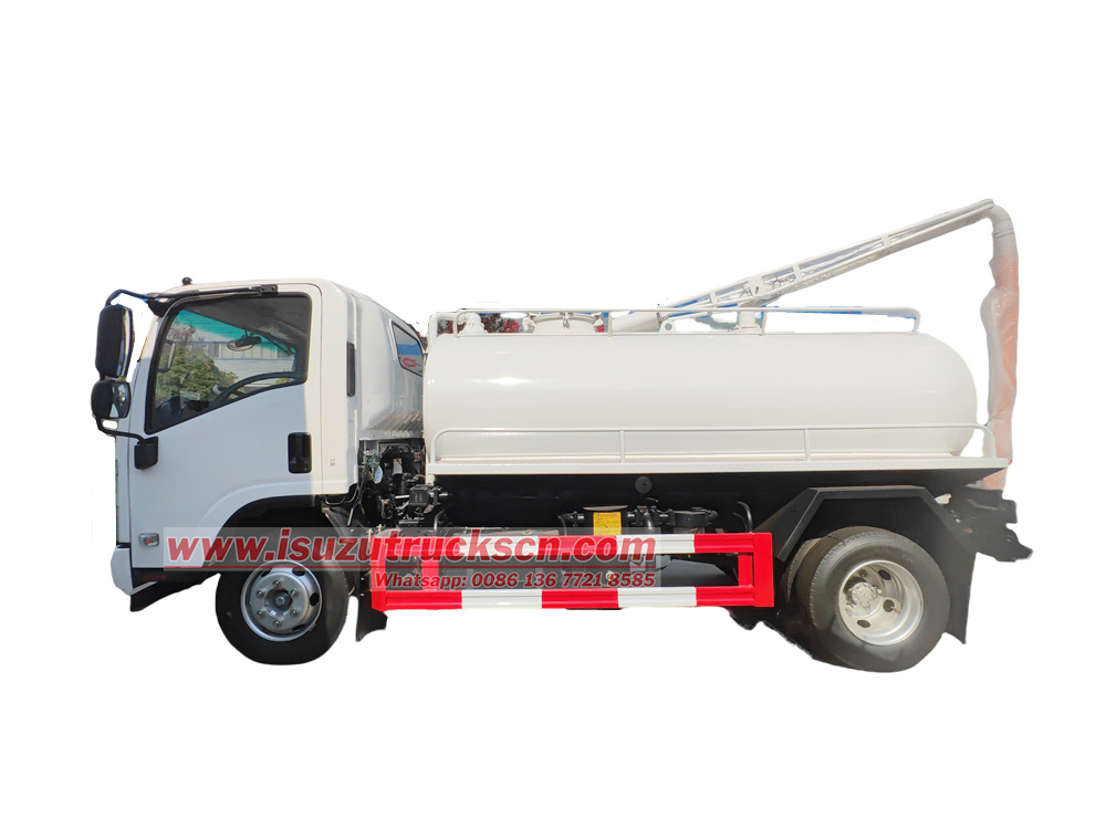 The Isuzu KV100 5cbm septic tank truck is midified on the Isuzu KV100 cab, 3360mm wheelbase, equipped with an Isuzu 4KH1CN6LB 120-horsepower engine, and an Isuzu MSB 5-speed gearbox. The upper body is a 5-cubic-meter septic tank made of carbon steel with anti-corrosion and rust-proof treatment. It is equipped with a Yifeng SK-6 water ring vacuum pump with a maximum suction speed of 6 m³/min and a speed of 970 rpm. It has a 6-meter septic suction boom on the top, a view window, an overflow valve, a pressure gauge, and a rear discharge valve.